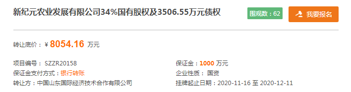 据公告显示,该项目挂牌价格8054.16万元,其中标的企业34%股权挂牌价为4547.61万元,另有3506.55万元,为转让方截至今年10月底所持标的企业34%股权对应的3506.55万元债权对应挂牌价。