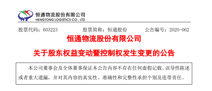 18日晚间,恒通物流股份有限公司(恒通股份 .603223.SH)发布公告称,原第一大股东、董事长刘振东、龙口南山投资有限公司(以下简称“南山投资”)与南山集团有限公司(以下简称“南山集团”)的股权转让已于11月18日办理完毕过户登记。