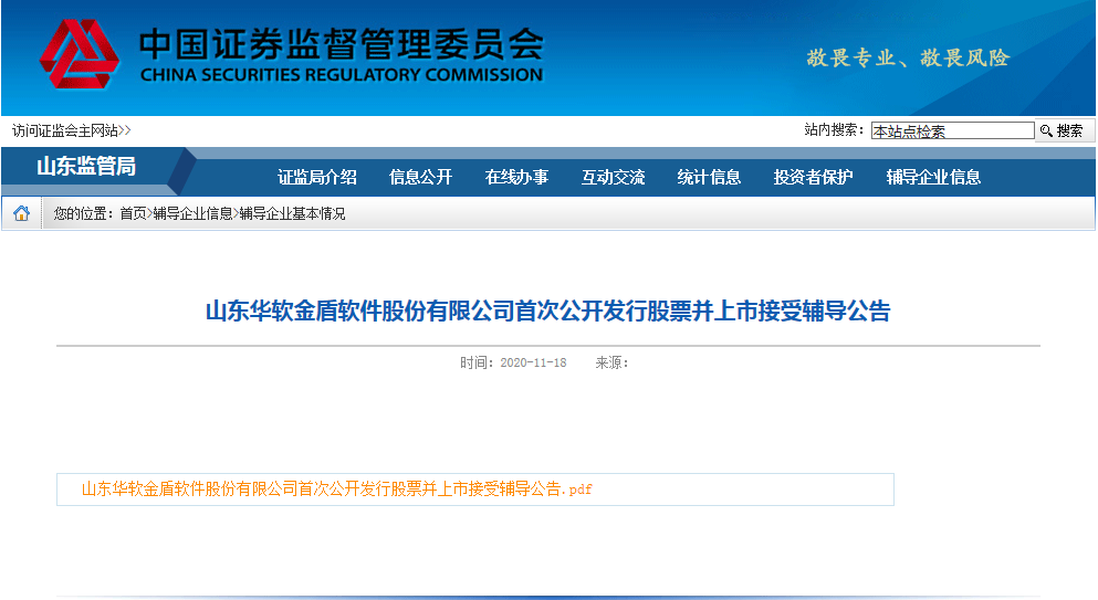 11月19日,鲁网·泰山财经记者从中国证券监督管理委员会山东监管局(简称“山东监管局”)获悉,民生证券股份有限公司发布了关于山东华软金盾软件股份有限公司(简称“金盾软件”)首次公开发行股票并在科创板上市接受辅导的公告。