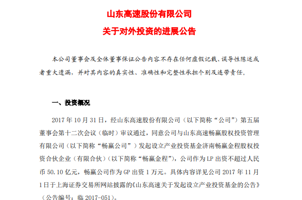 据悉,2017年10月31日,山东高速和山东高速畅赢股权投资管理有限公司发起设立产业投资基金畅赢金程。山东高速作为LP出资不超过50.1亿元,畅赢公司作为GP出资1万元。2017年11月,该基金投资了恒大地产项目,畅赢金程与广州市凯隆置业有限公司、恒大地产集团有限公司、许家印签署《关于恒大地产集团有限公司的增资协议书》及《补充协议》,畅赢金程投资50亿元认缴恒大地产新增资本。增资完成后,畅赢金程持有恒大地产1.1759%股权。