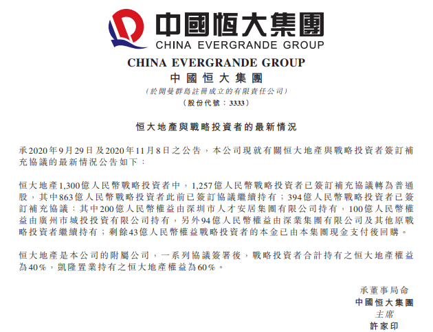 11月22日晚间,中国恒大( 03333.HK)在港交所披露恒大地产与战略投资者的最新情况。在1300亿人民币战略投资者中,1257亿元已签订补充协议转为普通股,剩余43亿元战略投资者的本金已由恒大现金支付后回购。