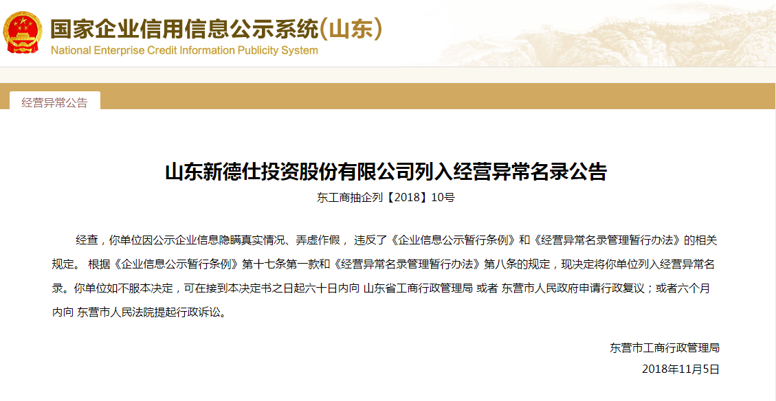 鲁网·泰山财经记者发现,山东新德仕投资股份有限公司曾于2018年被东营市工商行政管理局列为经营异常名录。原因为公示企业信息隐瞒真实情况、弄虚作假。
