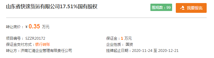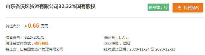 24日,山东国惠资产管理有限公司(简称“山东国惠”)及其子公司济南汇清企业管理有限责任公司分别在山东产权交易中心发布公告,拟转让山东省快速货运有限公司共计49.83%的股权,总底价为1万元,转让时间2020年11月24日至12月21日。其中,山东国惠在公告中称,两股权转让项目需同时受让。