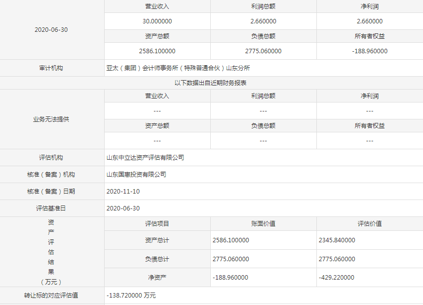 标的企业财务数据显示,截至今年6月底时,标的企业营收30万元,净利润2.66万元,资产总额2586.10万元,负债总额2775.06万元。另据山东中立达资产评估有限公司评估,标的企业资产总计2345.84万元,负债总计2775.06万元,净资产-429.22万元,推算转让评估值为-138.72万元。