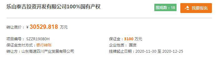 30日上午,山东高速集团有限公司(简称“山东高速集团”)旗下全资子公司山东高速四川产业发展有限公司发布公告称,拟转让旗下乐山泰吉投资开发有限公司100%国有产权,转让价为3.05亿元,与上次转让相比,降价3392.20万元。