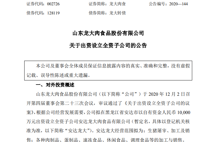 鲁网·泰山财经记者梳理发现,安达龙大的建立,系龙大肉食今年在安达设立的第二家公司。今年4月底,龙大肉食曾公告称,位于安达市的黑龙江龙大养殖有限公司,已完成工商登记手续,并取得安达市市场监督管理局颁发的营业执照。据悉,该公司注册资金1亿元,主营牲畜饲养、销售;畜牧良种繁殖活动等内容。