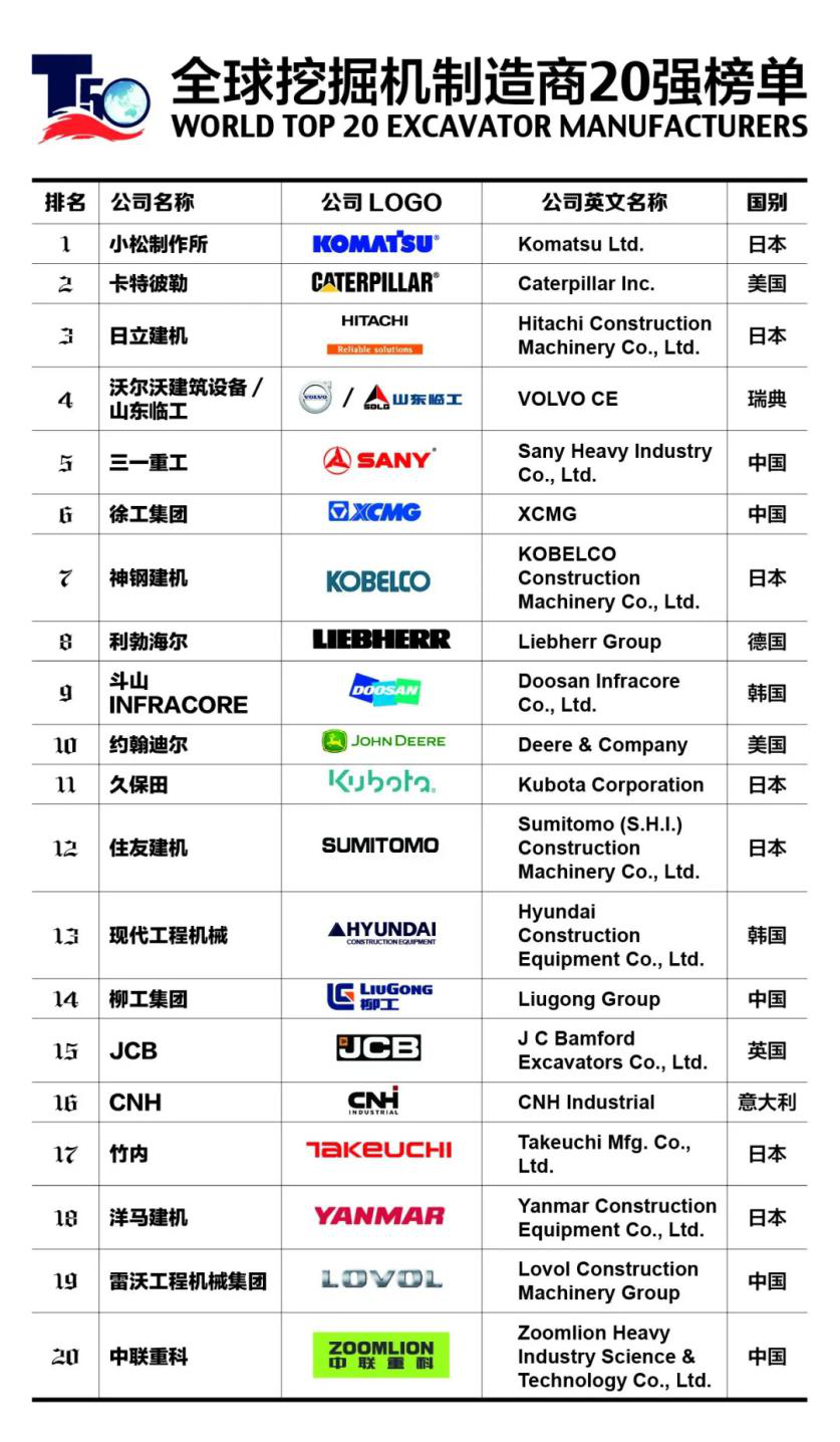 “挖掘机学校哪家强?中国山东找蓝翔”,一句家喻户晓的广告,使得“山东”与“挖掘机”紧紧联系在了一起。近日,Mysteel发布2020全球挖掘机制造商20强榜单,三一重工(第5名)、徐工集团(第6名)、柳工集团(第14名)、雷沃工程机械集团(第19名)与中联重科(第20名)5家中国企业入榜,而排在榜单第一的则是来自日本的小松制作所。