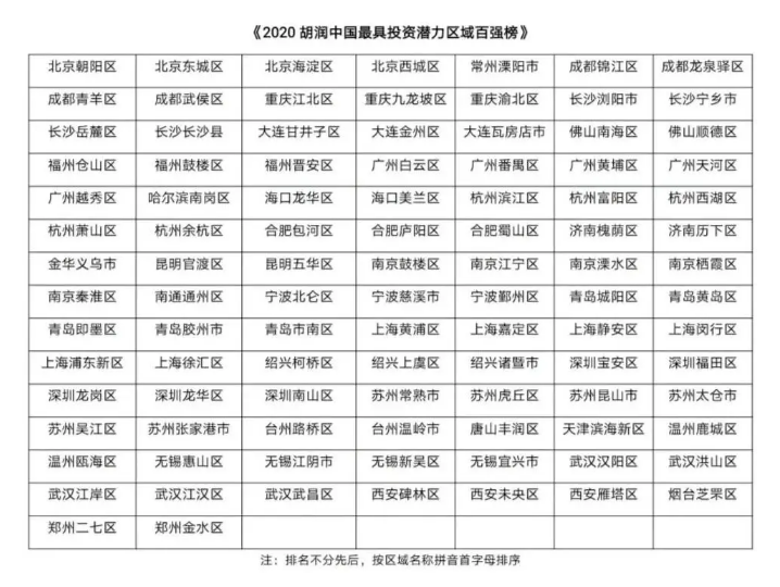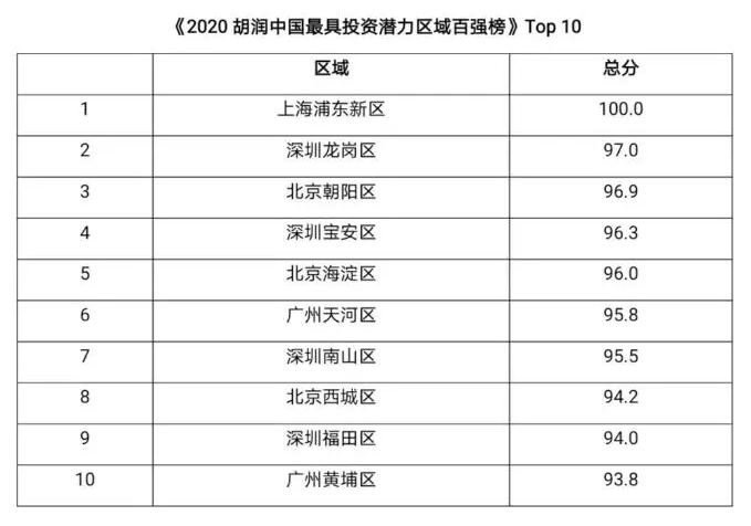 12月6日,胡润研究院首次发布《2020胡润中国最具投资潜力区域百强榜》,上海浦东新区位居榜首,其次是深圳龙岗区、北京朝阳区、深圳宝安区和北京海淀区。