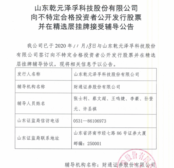 鲁网·泰山财经记者获悉山东乾元泽孚科技股份有限公司(乾元泽孚.831092.OC)已于11月18日与财通证券股份有限公司签订向不特定合格投资者公开发行股票并在精选层挂牌辅导协议,并于近日在山东监管局备案。