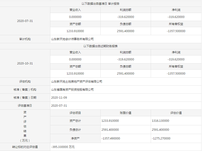 山东新天地土地房地产资产评估有限公司曾以该企业7月1日的财务值为评估基准日,得出该企业资产总计1316.13万元,负债总计2591.40万元,净资产-1275.27万元,推算转让评估值为-395.33万元。