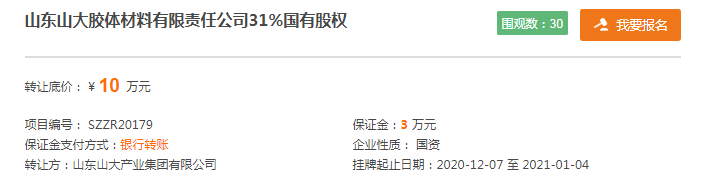 7日下午,山东山大产业集团有限公司(简称“山大产业集团”)发布公告称,拟以10万元底价转让山东山大胶体材料有限责任公司31%股权,转让时间为12月7日至1月4日。值得注意的是,山东新天地土地房地产资产评估有限公司曾以该企业7月1日的财务值为评估基准日,得出该企业转让评估值为-395.33万元。