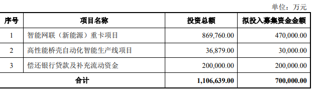 据悉,中国重汽本次非公开发行股票数量不超过1.68亿股,募集资金总额不超过70亿元,募集资金扣除相关发行费用后将全部用于智能网联(新能源)重卡项目、高性能桥壳自动化智能生产线项目、偿还银行贷款及补充流动资金。