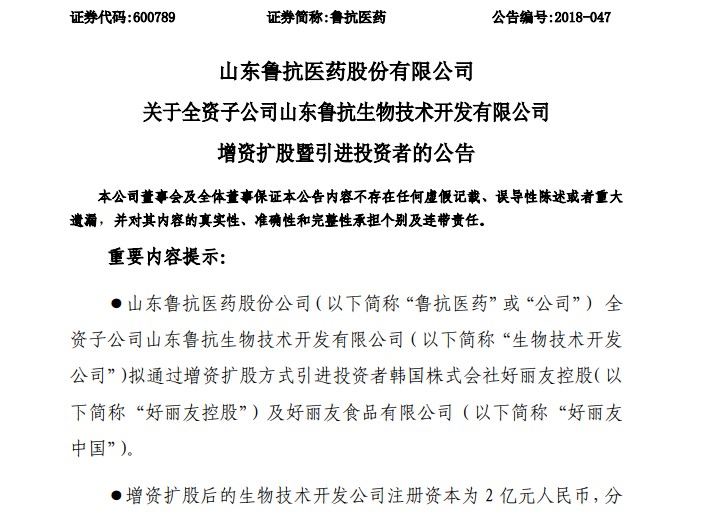 4日,山东鲁抗生物技术开发有限公司(简称“鲁抗生物”)在山东产权交易中心发布公告,拟通过增资扩股方式引进1名战略投资者,募集不低于7838.38万元资金,对应持股比例为65%。鲁网·泰山财经记者注意到,早在10月31日,鲁抗生物全资控股股东山东鲁抗医药股份有限公司(鲁抗医药.600789.SH)曾公告称,鲁抗生物拟引进投资者韩国株式会社好丽友控股(简称“好丽友控股”)和好丽友食品有限公司(简称“好丽友中国”),共同从事化学及生物药品、诊断试剂等的研发及生产。