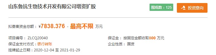 鲁抗生物成立于2009年9月,位于济宁市高新区,主营医药、兽用生物药品、生物化学农药和保健食品等业务。据了解,目前鲁抗生物注册资本500万元,本次拟新增注册资本1.15亿元。其中,原股东鲁抗医药认购注册资本3700万元,引入战投认购注册资本7800万元,占增资后公司总注册资本的65%,增资额不低于7838.376万元,超出注册资本的部分将计入增资企业资本公积。