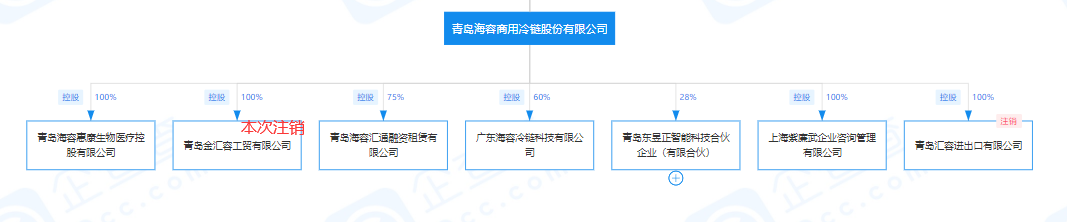 据企查查显示,目前海容冷链共有5家在业子公司,其中有青岛海容惠康生物医疗控股有限公司、上海紫廉武企业咨询管理有限公司两家为全资子公司,青岛海容汇通融资租赁有限公司(控股75%)、广东海容冷链科技有限公司(控股60%)两家为控股子公司,青岛东昱正智能科技合伙企业(有限合伙)为参股公司,海容冷链持股28%。(记者 徐文轩)