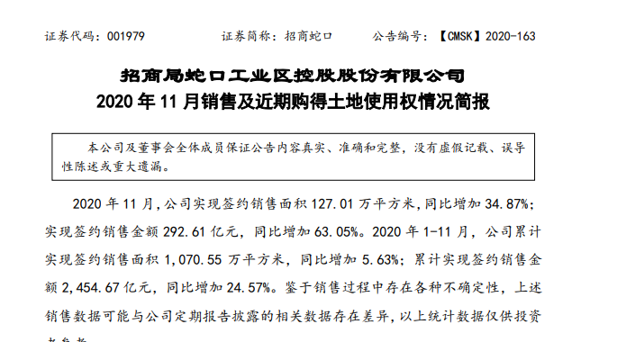 12月10日,招商局蛇口工业区控股股份有限公司(招商蛇口.001979.SZ)披露了11月销售及近期购得土地使用权情况简报。据了解,11月单月,招商蛇口实现签约销售面积127.01万平方米,同比增加34.87%;实现签约销售金额292.61亿元,同比增加63.05%。另外,自10月以来,公司近期新增11个项目,其中包括以12.35亿元成交价,竞得济南市历下区盛福片区共计 8.69万平方米的项目。
