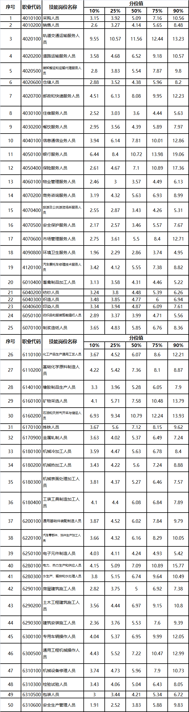 2019年50个技能岗位工资价位与2018年相比,总体增长9.7%。其中,增长最快的是信息通信业务人员、制浆造纸人员、道路运输服务人员等4个职业,中位数增长幅度超过20%。