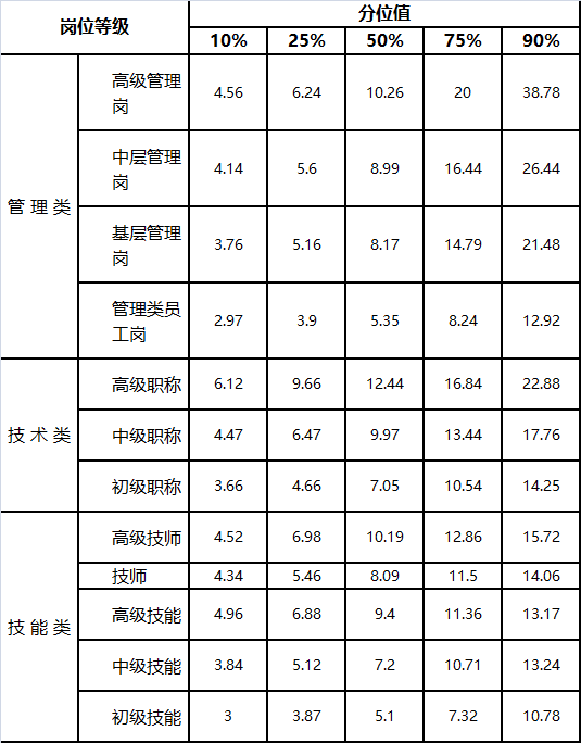 从技能岗位工资价位看,工资较高的3个职业是银行服务人员、保险服务人员、电力热力生产和供应人员,高位数年薪超过15万元;工资较低的3个职业是安全保护服务人员、环境卫生服务人员、安全生产管理人员,低位数年薪约2万元。从岗位等级工资价位看,年薪与岗位等级成正比,岗位等级越高,年薪越高。高级管理岗、高级职称、高级技师高位数年薪分别为38.78万元、22.88万元、15.72万元。