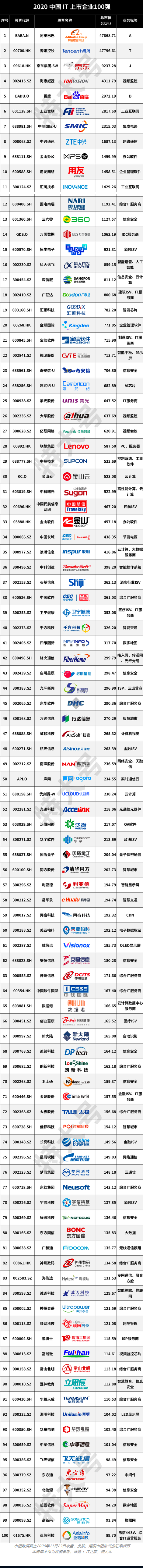 《2020中国IT上市企业100强》榜单近日发布,榜单涵盖了纽交所、纳斯达克、港股、沪深主板、中小板、创业板以及最新的科创板上市企业。