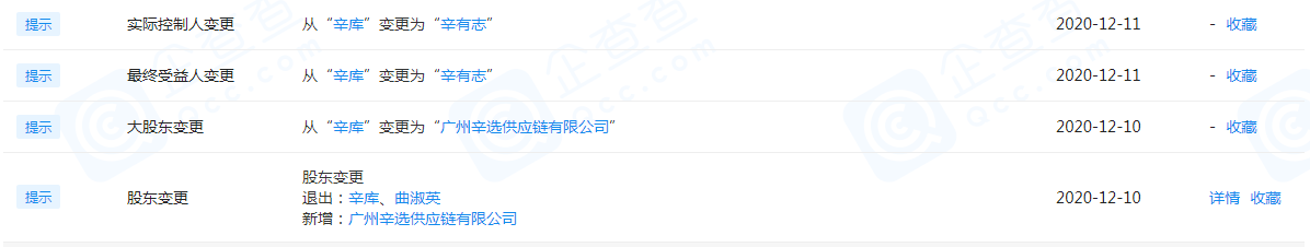 企查查APP显示,广州和祥贸易有限责任公司于12月10日发生变更,原股东辛库(辛有志父亲)、曲淑英退出,新增股东广州辛选供应链有限公司,目前辛有志变更为该公司实际控制人、最终受益人。