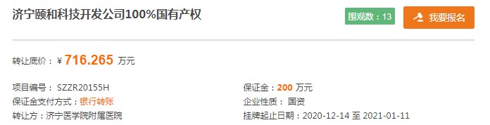 今日,济宁医学院附属医院在山东产权交易中心发布公告称,拟转让济宁颐和科技开发公司(简称“颐和科技”)100%国有产权,转让价为716.27万元,转让时间为12月14日至2021年1月11日。值得一提的是,该项目曾于11月13日以795.85万元正式挂牌,后因挂牌期满而撤牌。