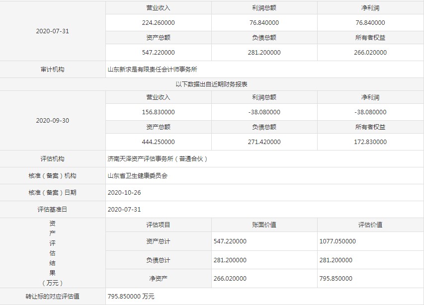 在其重大事项披露中,鲁网·泰山财经记者注意到,标的企业已进行清产核资,具体信息公布于鲁新求验字(2020)第394号《清产核资专项审计报告》中。另外,济宁医学院附属医院主管部门山东省卫生健康委员会(简称“省卫健委”)在颐和科技11月13日披露的转让批复中称,本次转让系同意颐和科技进行市场化处置。