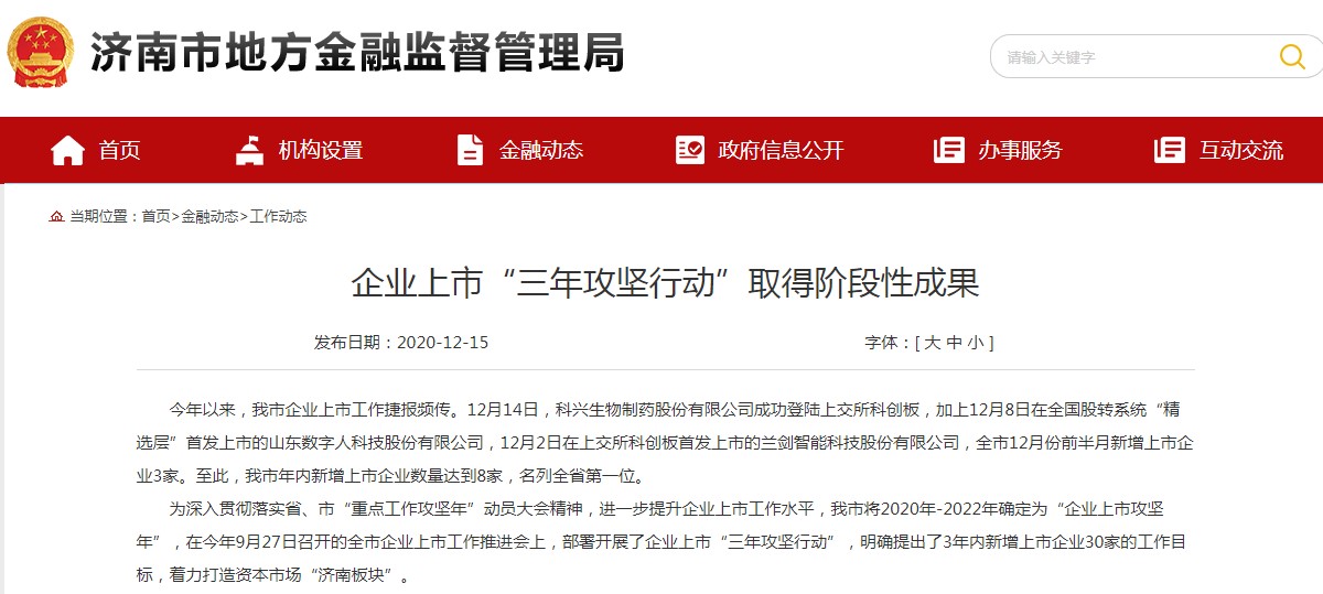 鲁网·泰山财经记者从济南市地方金融监督管理局获悉,今年以来,济南企业上市工作捷报频传。12月14日,科兴生物制药股份有限公司成功登陆上交所科创板,加上之前在全国股转系统“精选层”首发上市的山东数字人科技股份有限公司和在上交所科创板首发上市的兰剑智能科技股份有限公司,全市12月份前半月新增上市企业3家。至此,济南年内新增上市企业数量达到8家,名列全省第一位。