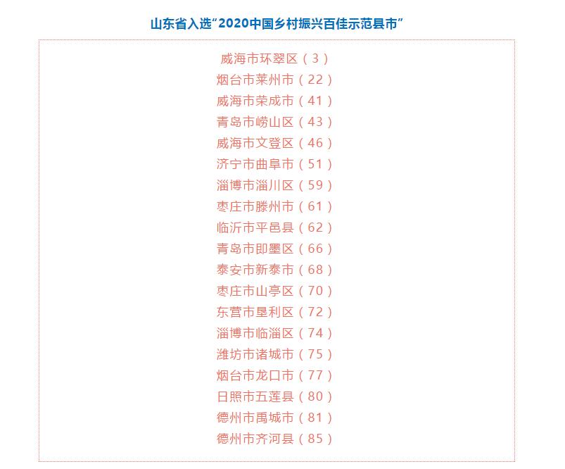 近日,《小康》杂志社联合多个国家权威部门和专业机构,推出“2020中国乡村振兴百佳示范县市”榜单,山东省共有19个县市上榜,成为最大赢家。