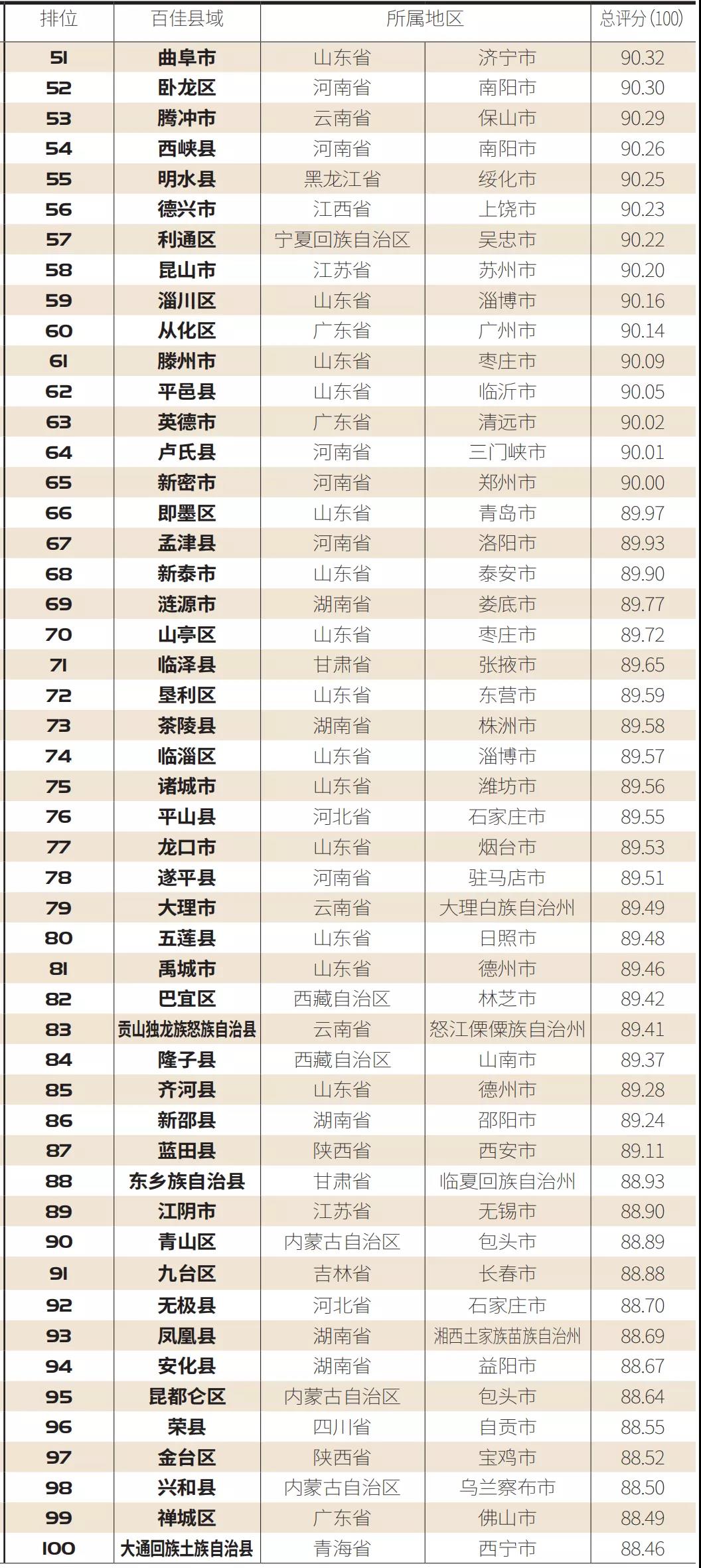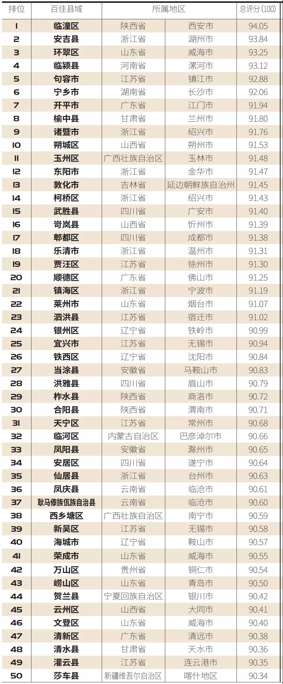 陕西省西安市临潼区、浙江省湖州市安吉县、山东省威海市环翠区、河南省漯河市临颍县、江苏省镇江市句容市、湖南省长沙市宁乡市、广东省江门市开平市、甘肃省兰州市榆中县、浙江省绍兴市诸暨市、山西省朔州市朔城区位列前十。