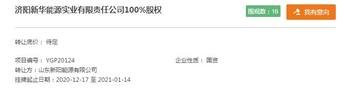 17日,山东新阳能源有限公司(简称“山东新阳能源”)在山东产权交易中心发布公告称,欲转让旗下济阳新华能源实业有限责任公司(简称“济阳新华能源”)100%股权,目前转让价未定,转让时间为2020年12月17日至2021年1月14日。