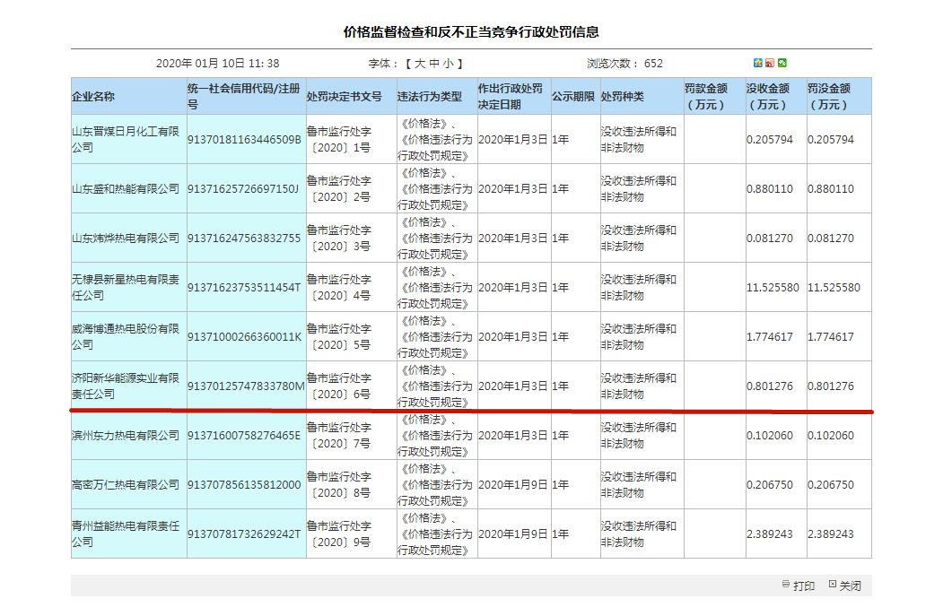 除此,鲁网·泰山财经记者注意到,今年1月10日时,山东省市场监督管理局在一则关于“价格监督检查和反不正当竞争行政处罚信息”的公告中点名济阳新华能源,因违反《价格法》、《价格违法行为行政处罚规定》,被处以罚款。 (记者 吴奕萱)