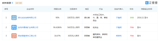 企查查显示,目前,除试试老赖公司外于建虎名下还有2家企业,分别为宝鸡市嘉城矿业有限公司、西安丽碧装饰工程公司,不过这两家公司已注销。