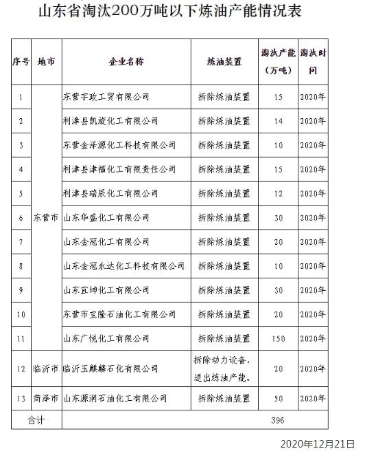 18日,山东省化工专项行动办公室公示了山东省淘汰200万吨以下炼油产能情况,截止11月底,经核查发现的13家企业200万吨以下炼油产能已退出,相关炼油装置已拆除。
