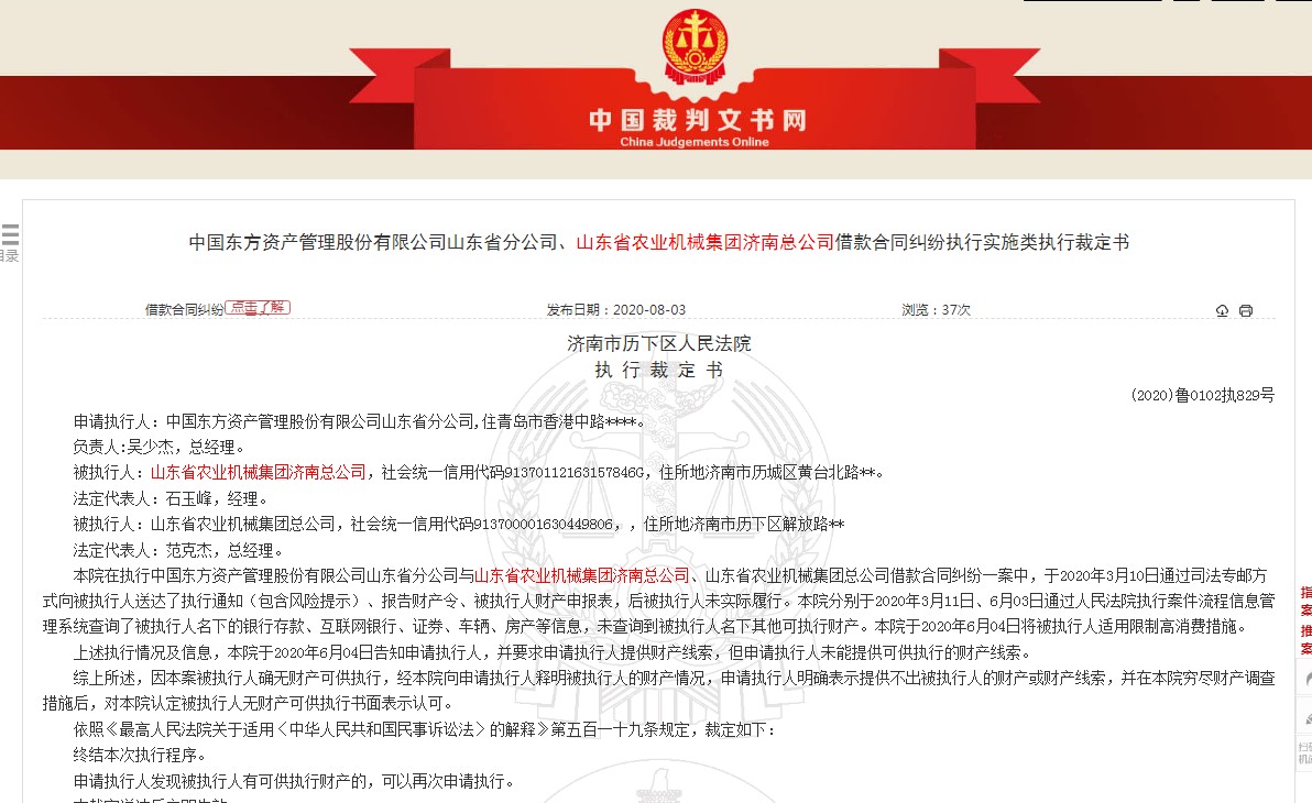鲁网·泰山财经记者在中国裁判文书网注意到,今年3月时,中国东方资产管理股份有限公司山东省分公司曾与山东省农业机械集团总公司发生借款合同纠纷的案件,根据济南市历下区人民法院审判,彼时山东省农业机械集团总公司名下已无可执行财产,随后在今年6月,济南市历下区人民法院将标的企业限制高消费。(记者 吴奕萱)