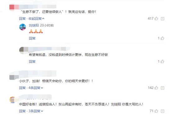 通常店铺突然倒闭,储存卡的问题店主都会选择含糊处理:连夜搬空,用A4纸打印一个告示,贴在店门不起眼的位置。他们认为大多储值卡的余额就几百块钱,很多人也就是认栽,也不会深究。看多了跑路店铺的网友,被刘继阳耿直的善良戳中了,纷纷为他打气、点赞。刘继阳在声明中也表示好多网友给他评论、点赞、私信,内容都是加油鼓励和安慰的话。
