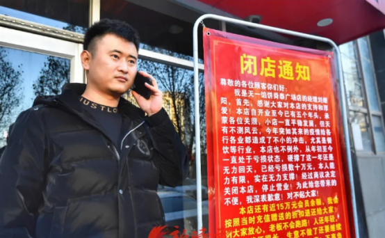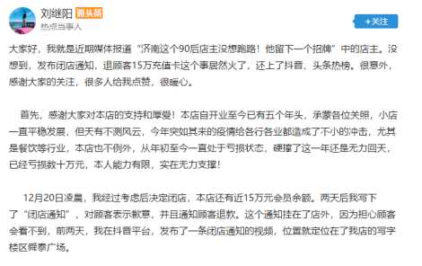 经过长时间的考虑后,12月20日凌晨刘继阳决定闭店,闭店后刘继阳想到的第一件事是还钱。之后,刘继阳写下了“闭店通知”将其挂在店外,并且通知顾客退款。因为担心顾客会看不到,刘继阳在抖音平台发布了一条闭店通知的视频,视频定位就在其快餐店所在的写字楼区舜泰广场。
