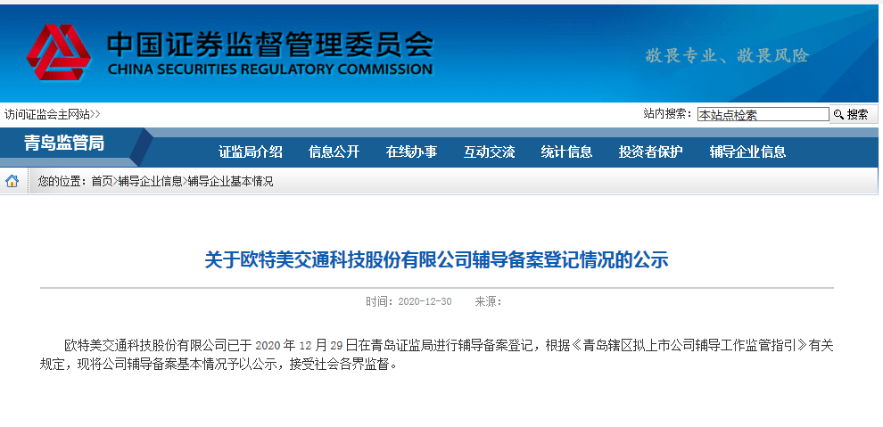 今日,鲁网·泰山财经记者从中国证券监督管理委员会青岛监管局(以下简称“青岛证监局”)获悉,欧特美交通科技股份有限公司(以下简称“欧特美交通”)已于2020年12月29日在青岛证监局进行辅导备案登记,辅导机构为中信建投证券股份有限公司。