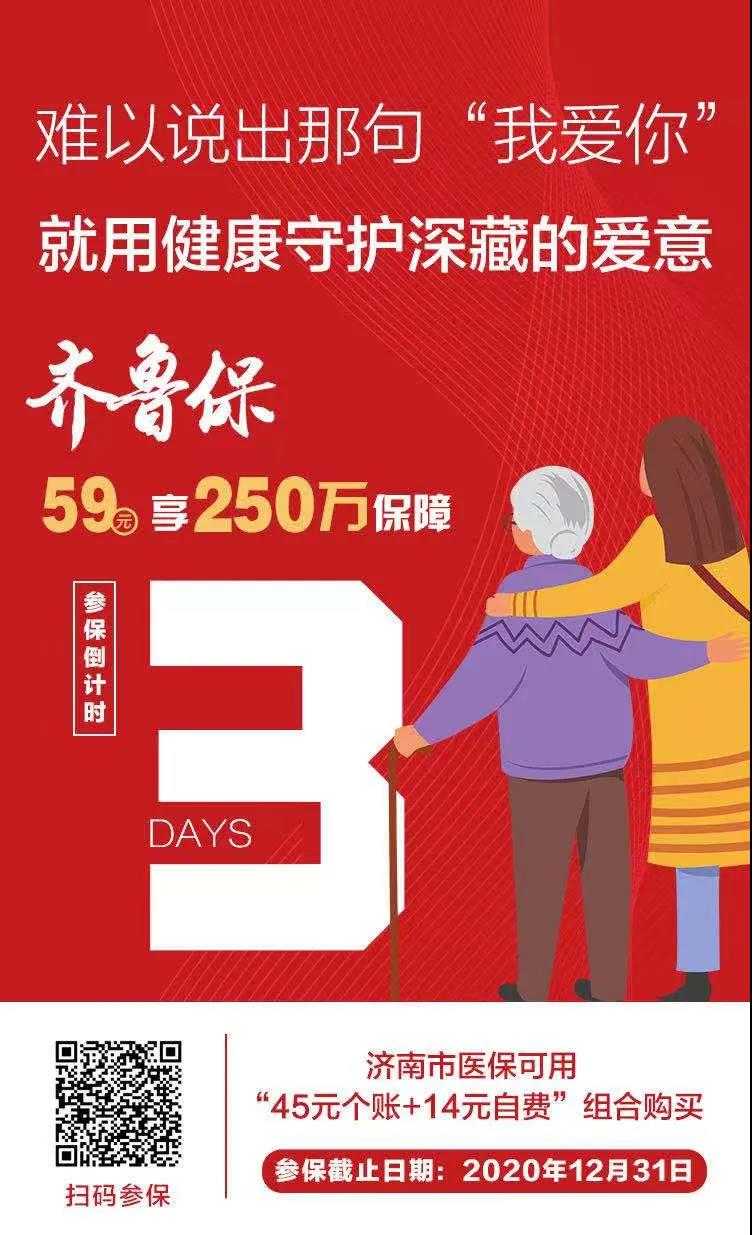 据了解,“齐鲁保”投保时间截止到12月31日。济南市基本医疗保险(含城市职工、居民)、省直职工医疗保险参保人,可微信关注“山东医保大健康”公众号,根据指引在线投保,自2021年1月1日起生效后无需等待期即可享受百万保障和医疗健康服务。
