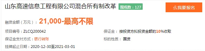 30日,山东高速信息工程有限公司在山东产权交易中心发布公告称,拟通过增资扩股的方式进行混合所有制改革,引进2名战略投资者。同时透露,本次合计拟新增注册资本4672.78万元,占增资后公司注册资本的18.939%,拟增资额不低于2.1亿元。值得注意的是,山东高速信息工程有限公司要求,新战投实缴注册资本须超1亿元。