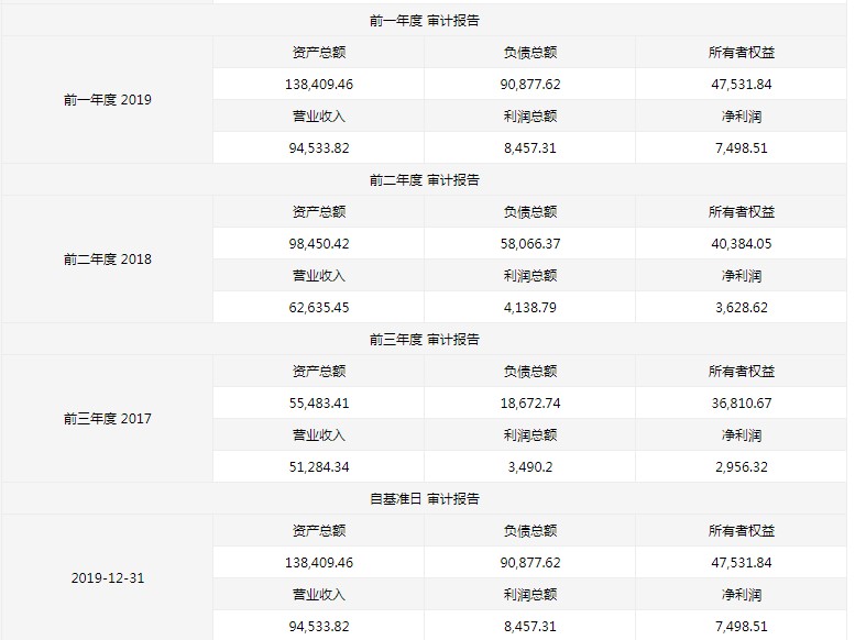 据标的企业财务数据显示,截至2019年12月底,该企业资产总额13.84亿元,负债总额9.09亿元,所有者权益为4.75亿元。从其营收方面看,标的企业近三年一直保持盈利状态,与2018年数据相比,截至2019年底时该企业营收翻了1.5倍,净利润更是翻了2倍,分别达9.45亿元、7498.51万元。