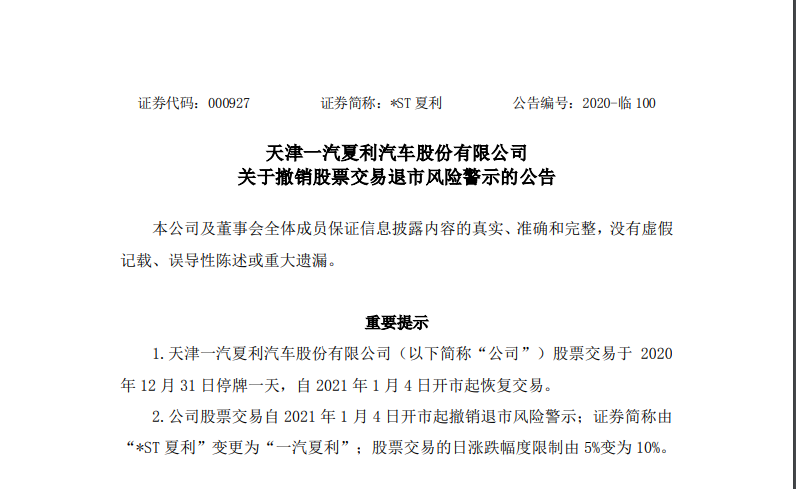 公告显示,公司股票于12月31日停牌一天,1月4日开市起恢复交易,并撤销退市风险警示。证券简称由“*ST夏利”变更为“一汽夏利”,证券代码“000927”保持不变,日涨跌幅限制由5%变更为10%。