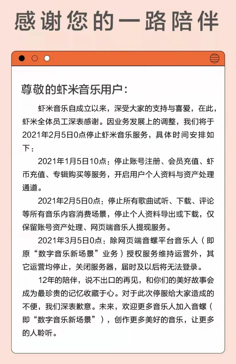 公告显示,从1月5日10 点起,虾米音乐停止账号注册、会员充值、虾币充值、专辑购买等服务,并开启用户个人资料与资产处理通道;2月5日0点起停止所有歌曲的试听、下载、评论所有音乐内容消费场景,停止个人资料导出或下载,仅保留账号资产处理、网页端音乐人提现服务;3月5日0 点起,除网页端音螺平台音乐人(即原“数字音乐新场景”业务)授权服务维持运营外,其它运营均停止,关闭服务器,届时及以后将无法登录。