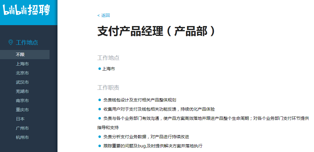 同时鲁网·泰山财经记者发现,B站在其官网以及多家招聘网站上开始招募支付开发工程师、支付产品经理等支付业务相关的岗位。其中对于资深支付开发工程师的工作职责描述中,明确提出“负责哔哩哔哩支付平台的核心技术研发工作(收单、支付、清结算、账务等)”;对于支付产品经理的工作职责描述中,明确提出“PM需负责钱包设计及支付相关产品整体规划”。