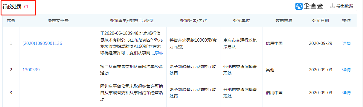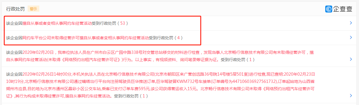 值得注意的是,因擅自从事或者变相从事网约车经营活动,该企业受到行政处罚的次数高达53次;因网约车平台公司未取得经营许可擅自从事或者变相从事网约车经营活动,该企业受到行政处罚4次。从2019月5月21日至今,北京畅行信息技术有限公司共计受到行政处罚71条。