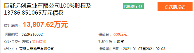 鲁网·泰山财经记者注意到,去年下半年起,水发集团加快了“退房”的速度,除了本次挂牌转让的远创置业外,2020年7月,水发集团旗下全资子公司水发民生产业投资集团有限公司,也发布了欲以1.93亿底价转让菏泽双玺置业有限公司(简称“双玺置业”)51%股权及1.17亿元债权,后于11月底公告称,双玺置业9月底已进行股权变更,目前系安徽中丞控股集团有限公司全资子公司,成交价为1.93亿元。此外,去年12月挂牌转让的菏泽市金地源置业有限公司51%国有股权及1.77亿元债权,也有1家意向受让方交纳了交易保证金。