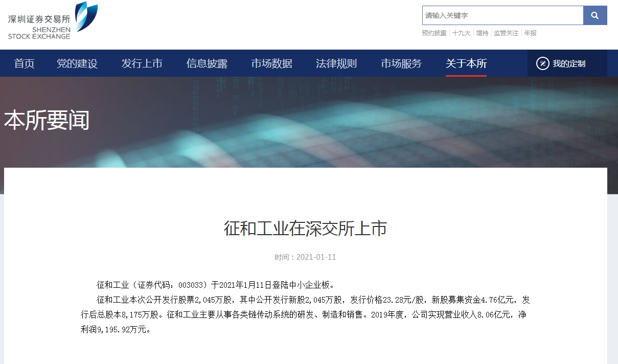 鲁网·泰山财经记者从深圳证券交易所(以下简称“深交所”)获悉,1月11日,青岛征和工业股份有限公司(征和工业.003033.SZ)在深交所中小板正式上市,成为2021年度青岛首家上市公司,也是平度市第一家上市企业。