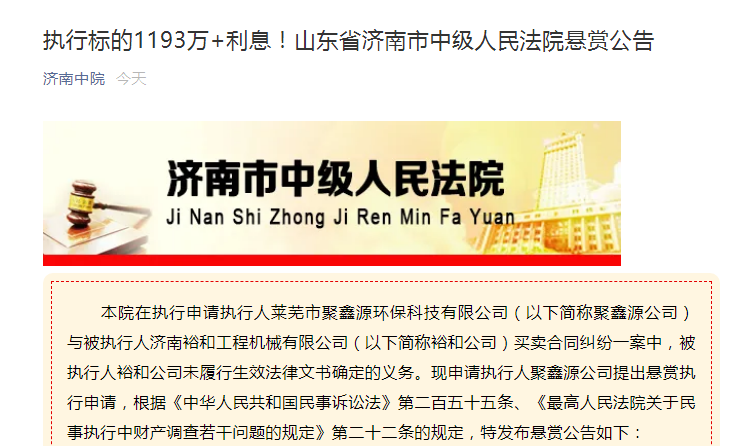 11日,山东省济南中级人民法院通过官方微信公众号发布一则悬赏公告,在一买卖合同纠纷案中,被执行人济南裕和工程机械有限公司(以下简称“裕和公司”)未履行生效法律文书确定的义务,现申请执行人莱芜市聚鑫源环保科技有限公司(以下简称“聚鑫源公司”)提出了悬赏执行申请,根据相关规定,济南市中级人民法院(以下简称“济南中院”)于4日发布悬赏公告。