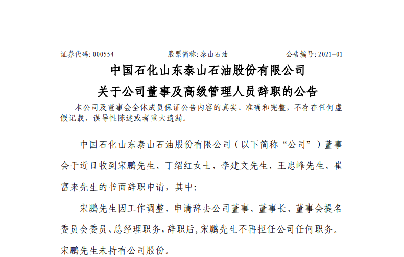 11日晚间,中国石化山东泰山石油股份有限公司(泰山石油.000554.SZ)在深交所披露,因工作调整,公司董事长宋鹏等多名高管辞职,并提名补选王明昌等人员为非独立董事。