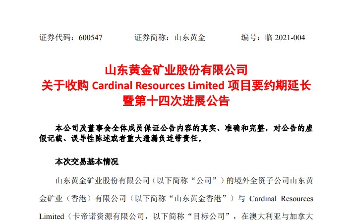 12日晚间,山东黄金矿业股份有限公司(山东黄金.600547.SH)发布公告称,为进一步推进要约交易,其境外全资子公司山东黄金矿业(香港)有限公司(简称“山东黄金香港”)与 Cardinal Resources Limited(译名卡帝诺资源有限公司,以下简称“目标公司”)的收购项目要约交易,将延长至2021年1月19日。据悉,目前山东黄金香港已持有目标公司82.56%股份。