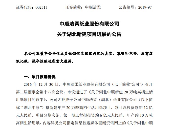 鲁网·泰山财经记者梳理公告发现,2016年12月时,中顺洁柔控股子公司中顺洁柔(湖北)纸业有限公司(以下简称“湖北中顺”)曾公告称,拟在湖北新建年产 20 万吨高档生活用纸项目,项目总投资额约12亿元人民币,将分期实施,第一期工程拟投资约6亿元人民币,年产约10万吨高档生活用纸。2019年12月,中顺洁柔公告称,该项目已完成一期验收。